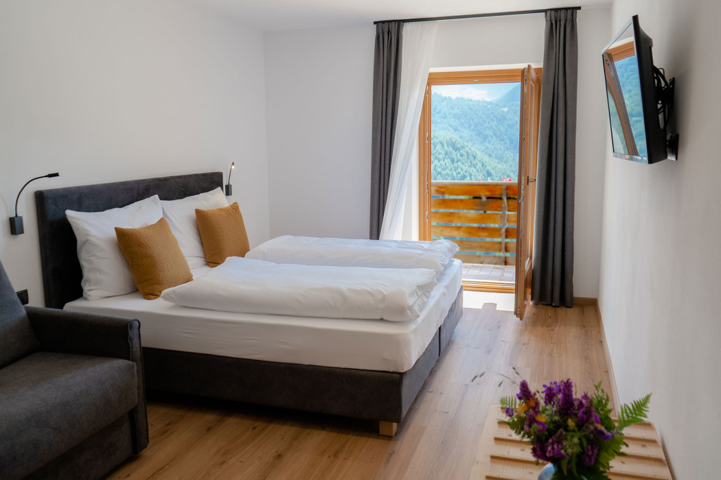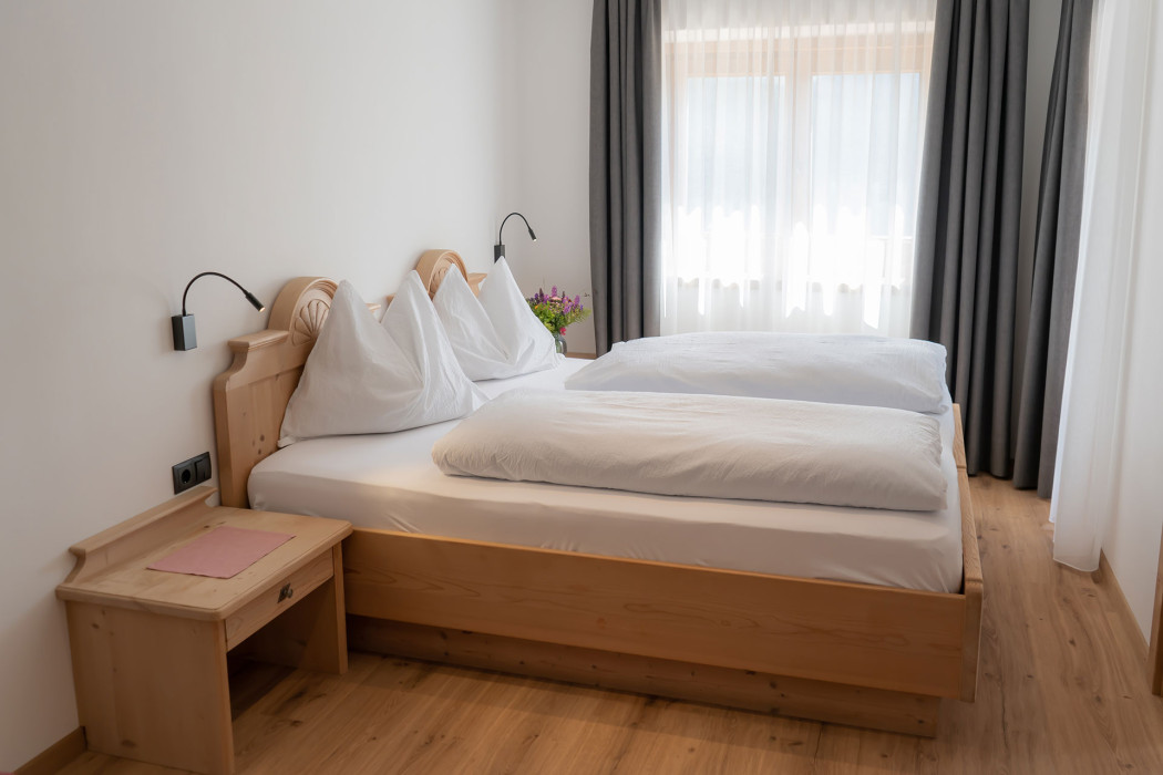 Unsere 2023 neu renovierten Zimmer und Bäder laden zum Erholen und Relaxen ein. Legen Sie die Füße hoch und genießen Sie die Ruhe in den Bergen.